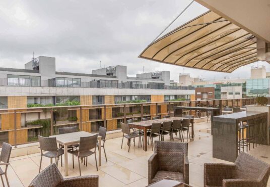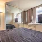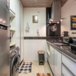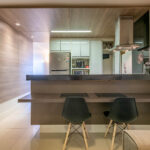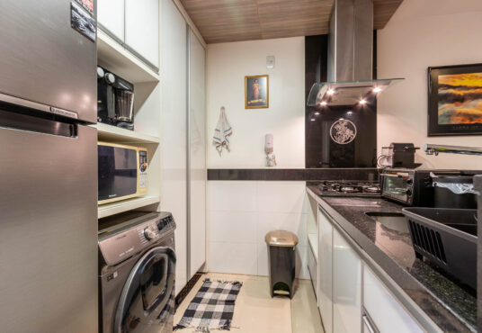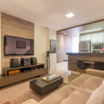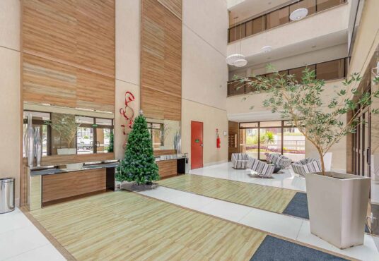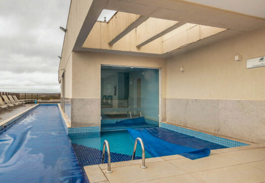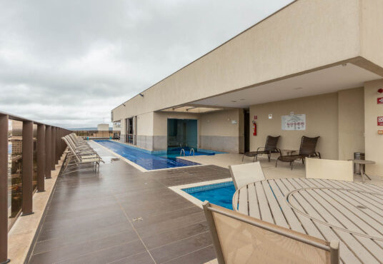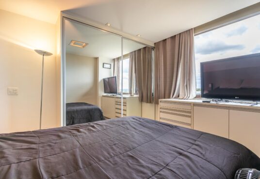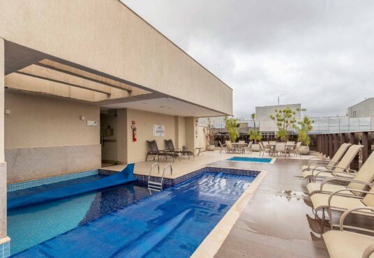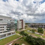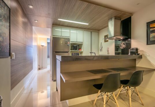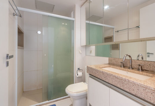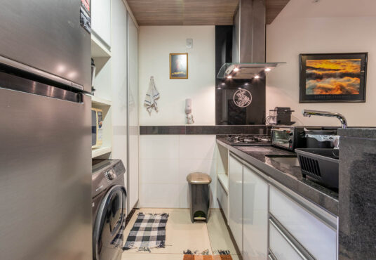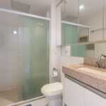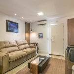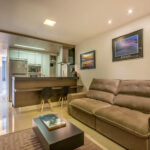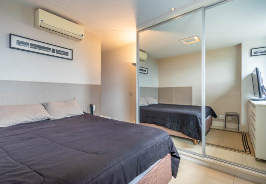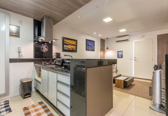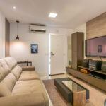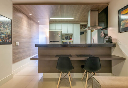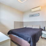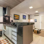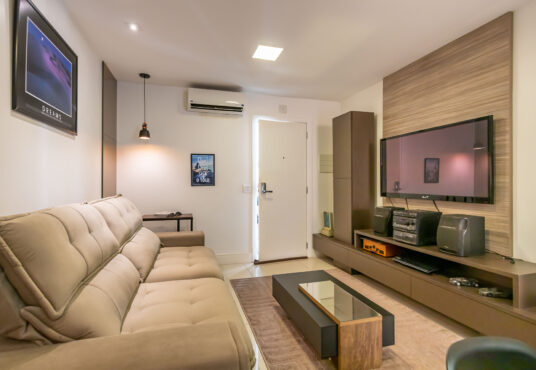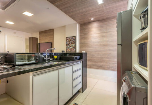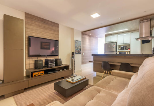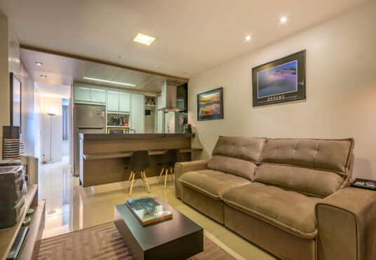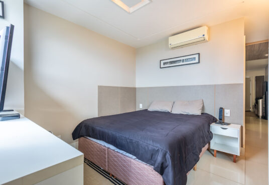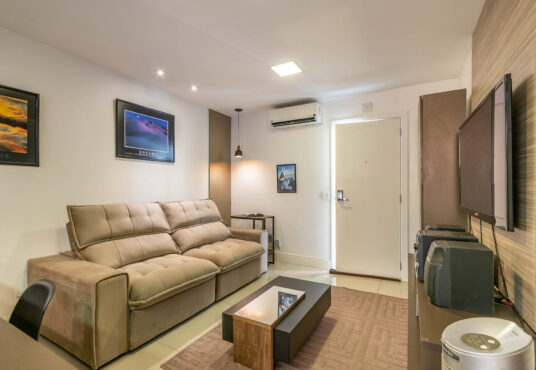 apartamento com 40 m² composto de sala com painel para tv e rack além do ar condicionado; cozinha americana com balcão para refeições, armários, coocktop, exaustor e triturador da pia. porcelanato bege polido 80 x 80 . banheiro com espelhos, armário e box com vidro temperado. suíte com armários com espelhos, ar condicionado; vista livre permanente.